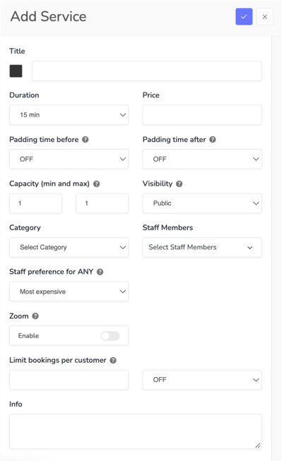 - Staff Members-Â Select the staff members of the service. A service must have at least one staff member.