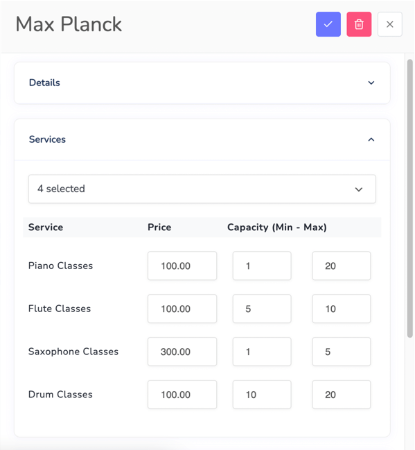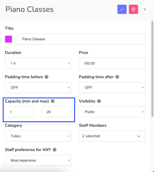 - Check the capacity field. Here you can specify the minimum and the maximum number of persons you want for the service at the same time.