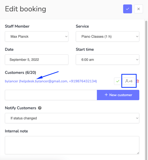 You can also edit the number of persons from the admin. For this click on the customer name on the edit booking side panel. And don't forget to save the booking after changing the number of person.