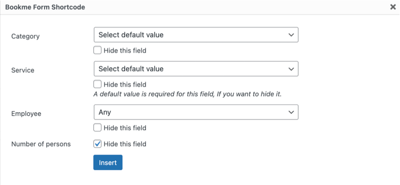 - Click on the button, and a form will appear. Now choose which fields will be visible to the customers in the booking form and click on the Insert button.
