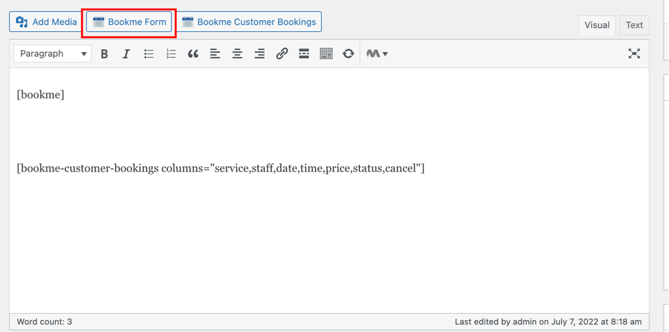 - If you are using an old version of WordPress or the classic editor, you will find the Bookme form button on the top of the classic editor.