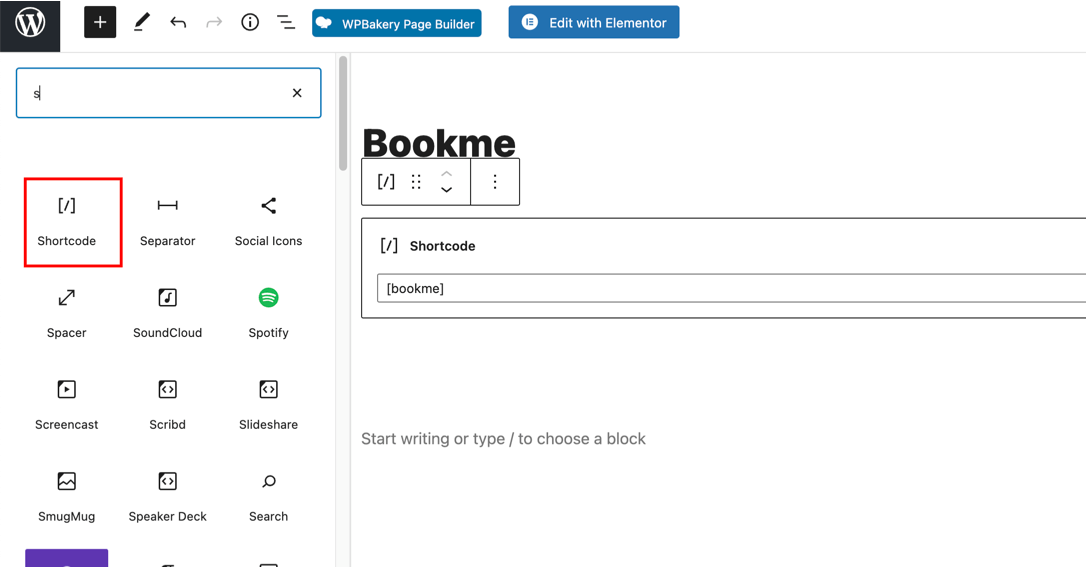 - Edit the post or page where you want to add the booking form. Click on the + button and select the shortcode block, and you will find an Add Bookme booking form button on the right sidebar.