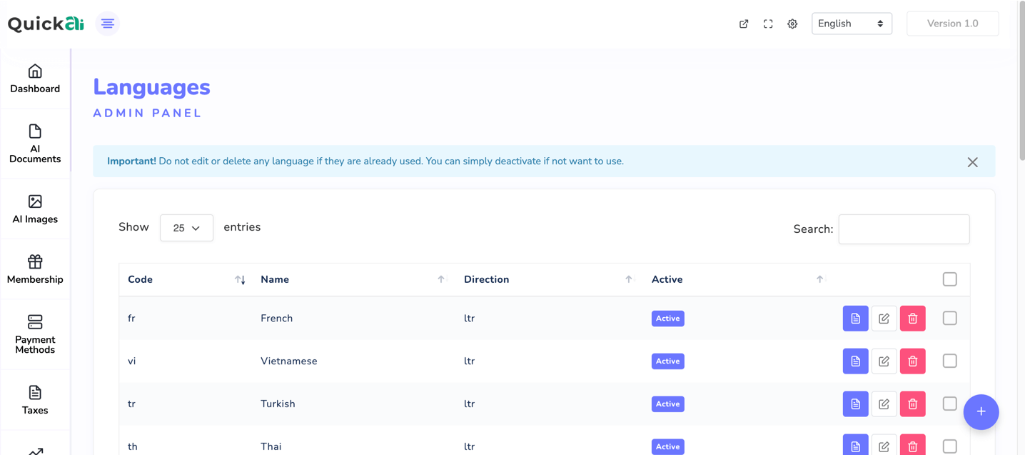 We have a multi-language management tool in our admin panel, here you can add your choice of language and manage it, and you can enable or disable any time. QuickCMS supports all languages.