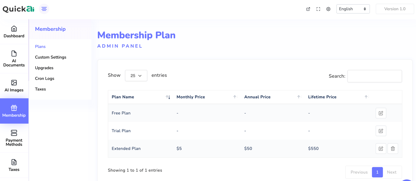 To manage the membership plans, go to admin -> Membership -> Plans. And here you can manage your membership plans.