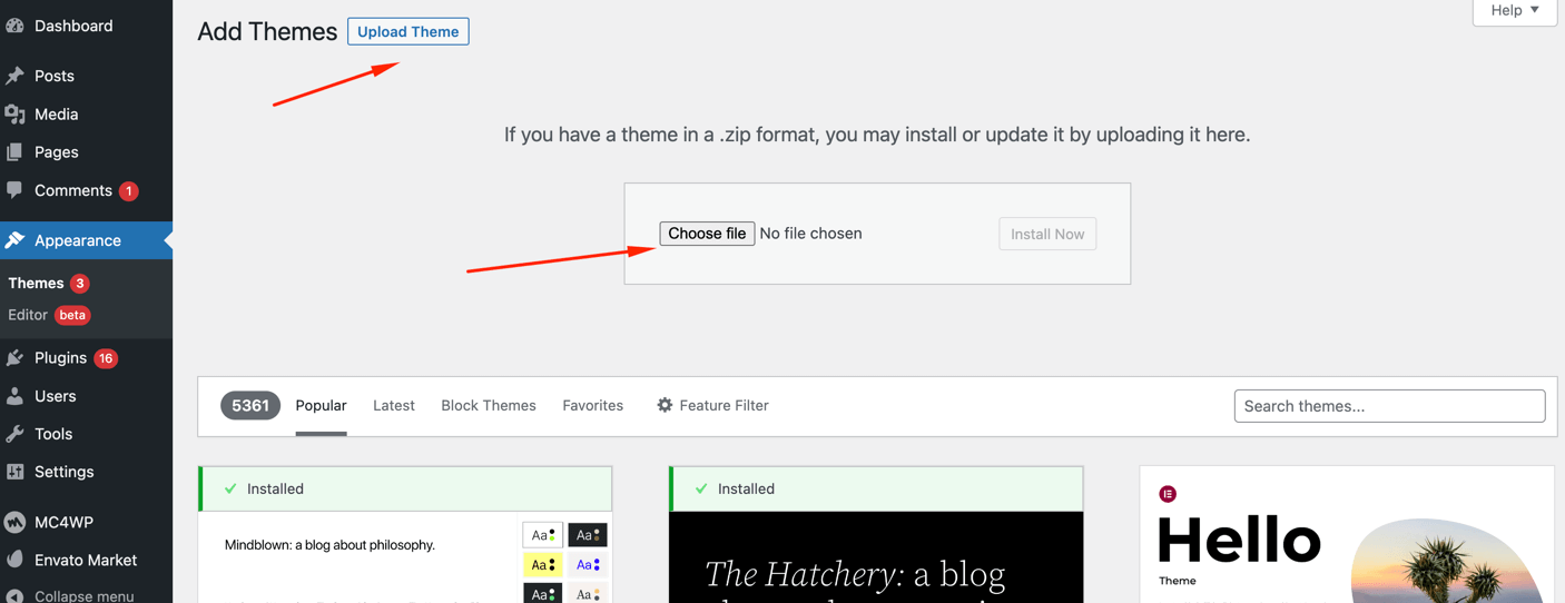 - Navigate to Appearance > Themes > Add New > Upload theme.