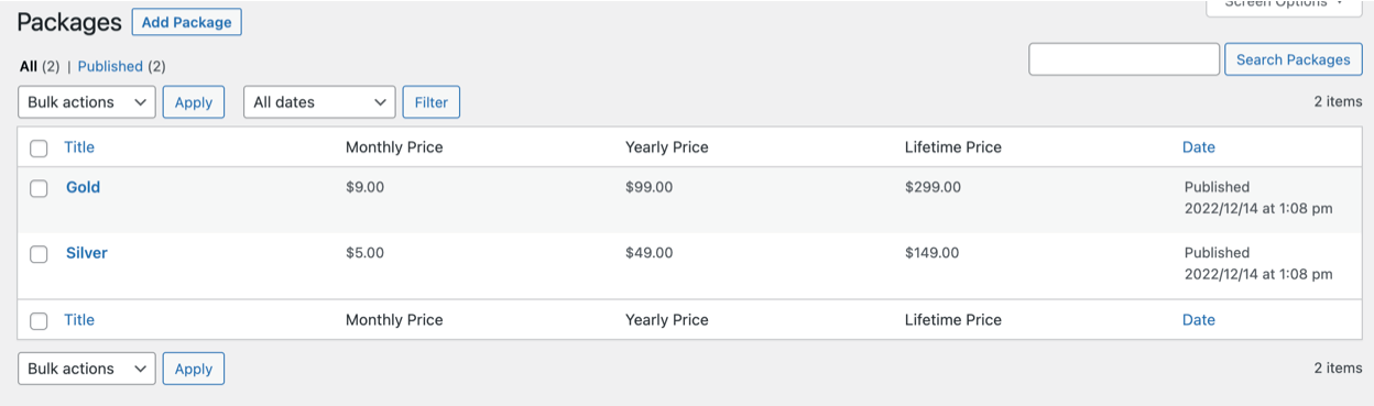 To add or edit membership packages. Go to admin > Membership > All packages, Here you will find a list of all the packages.